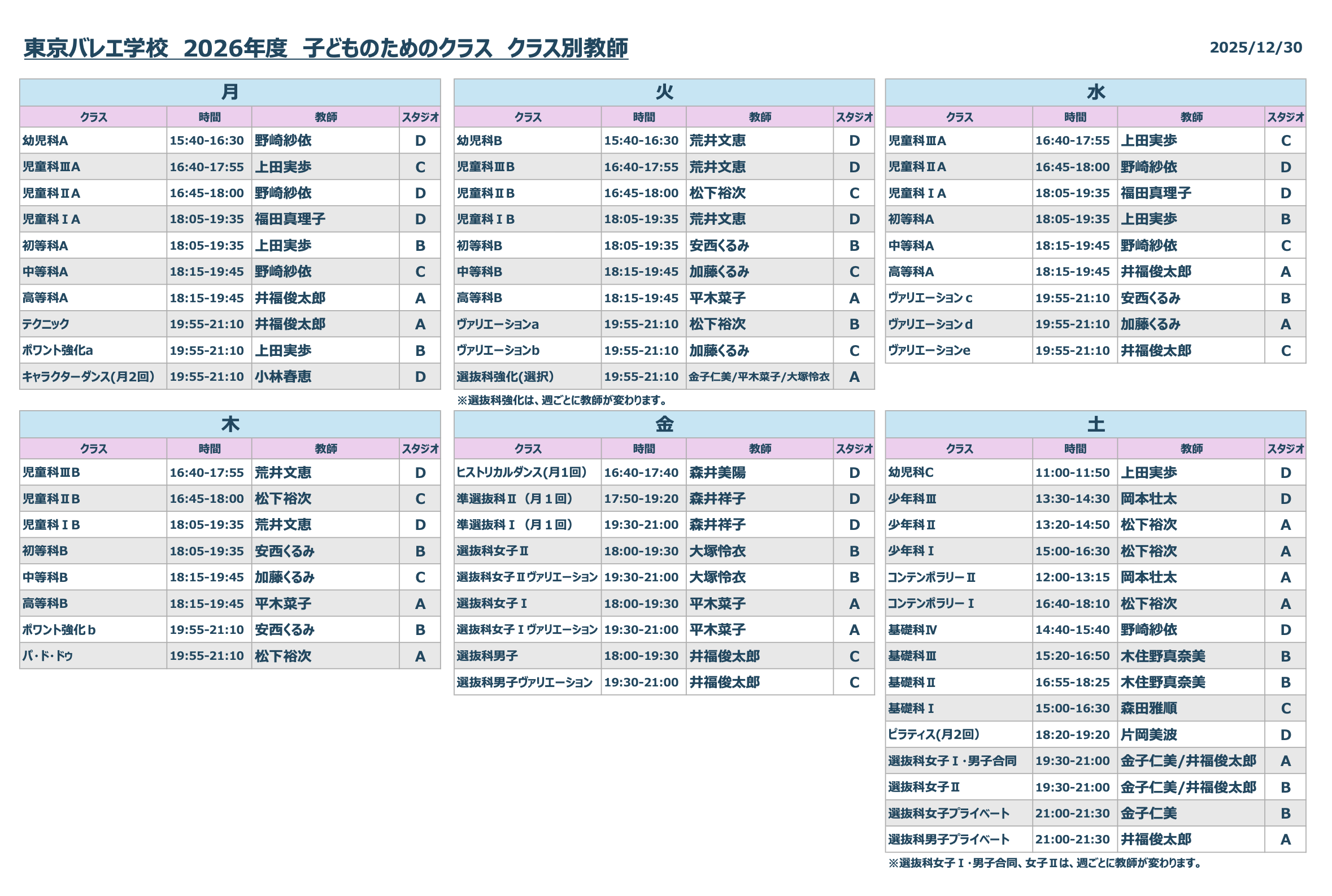 選抜科 2025年1月から、将来国内外でプロのダンサーを目指すためのクラスとして「選抜科」を新設いたしました。「クラシッククラス」と「ヴァリエーションクラス」を組み合わせたカリキュラムを展開し、舞台人として国内外で活躍する人材育成を目指します。また、「プライベートレッスン」では個人に合わせたきめ細やかな指導を行います。